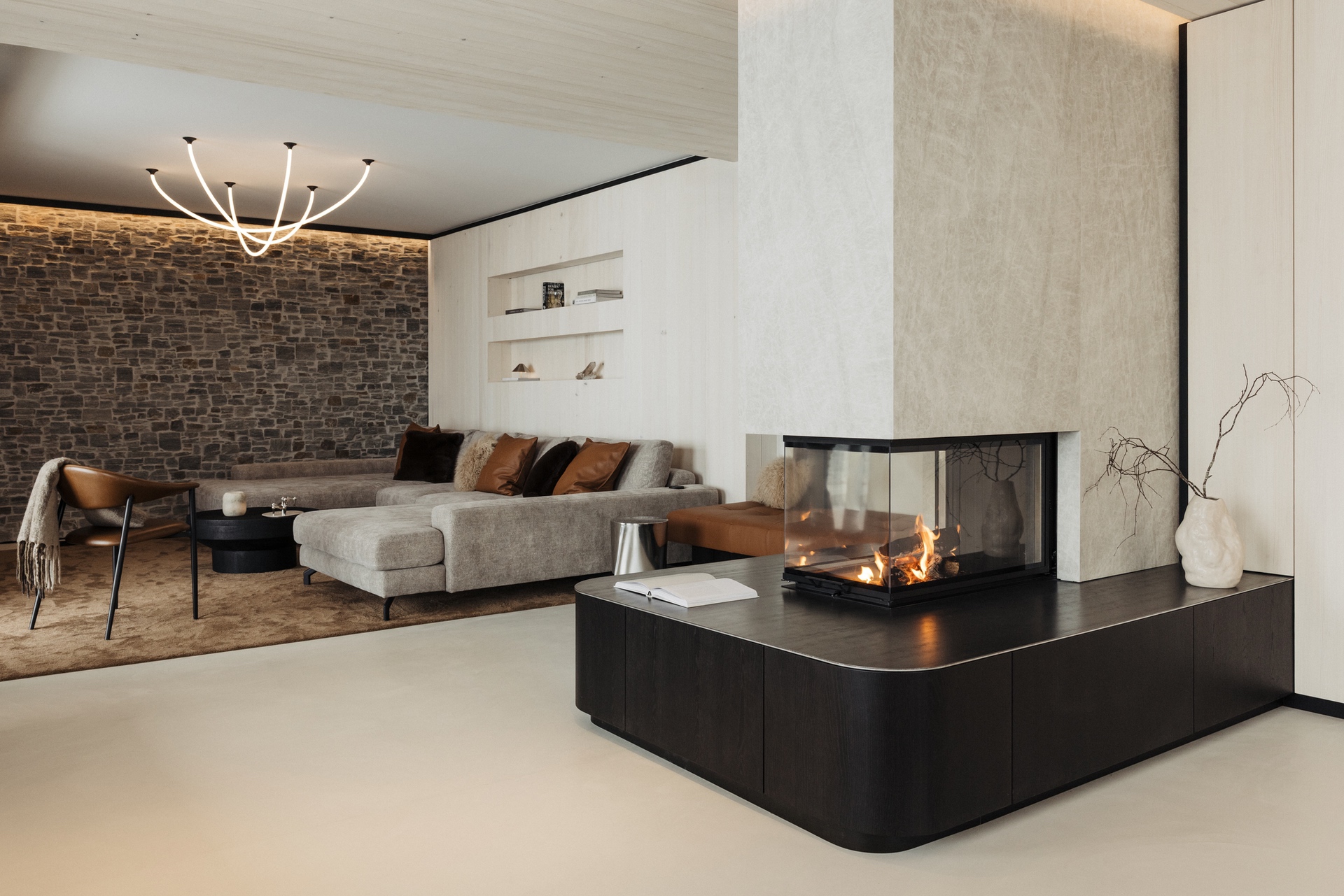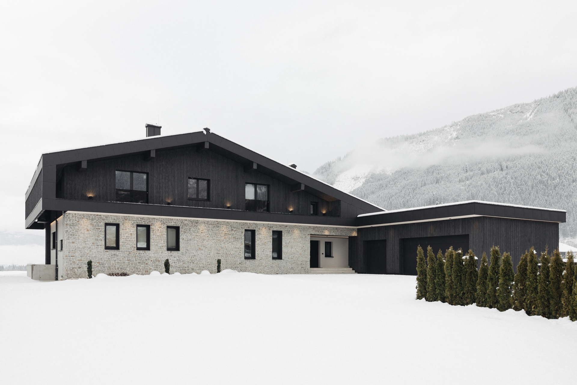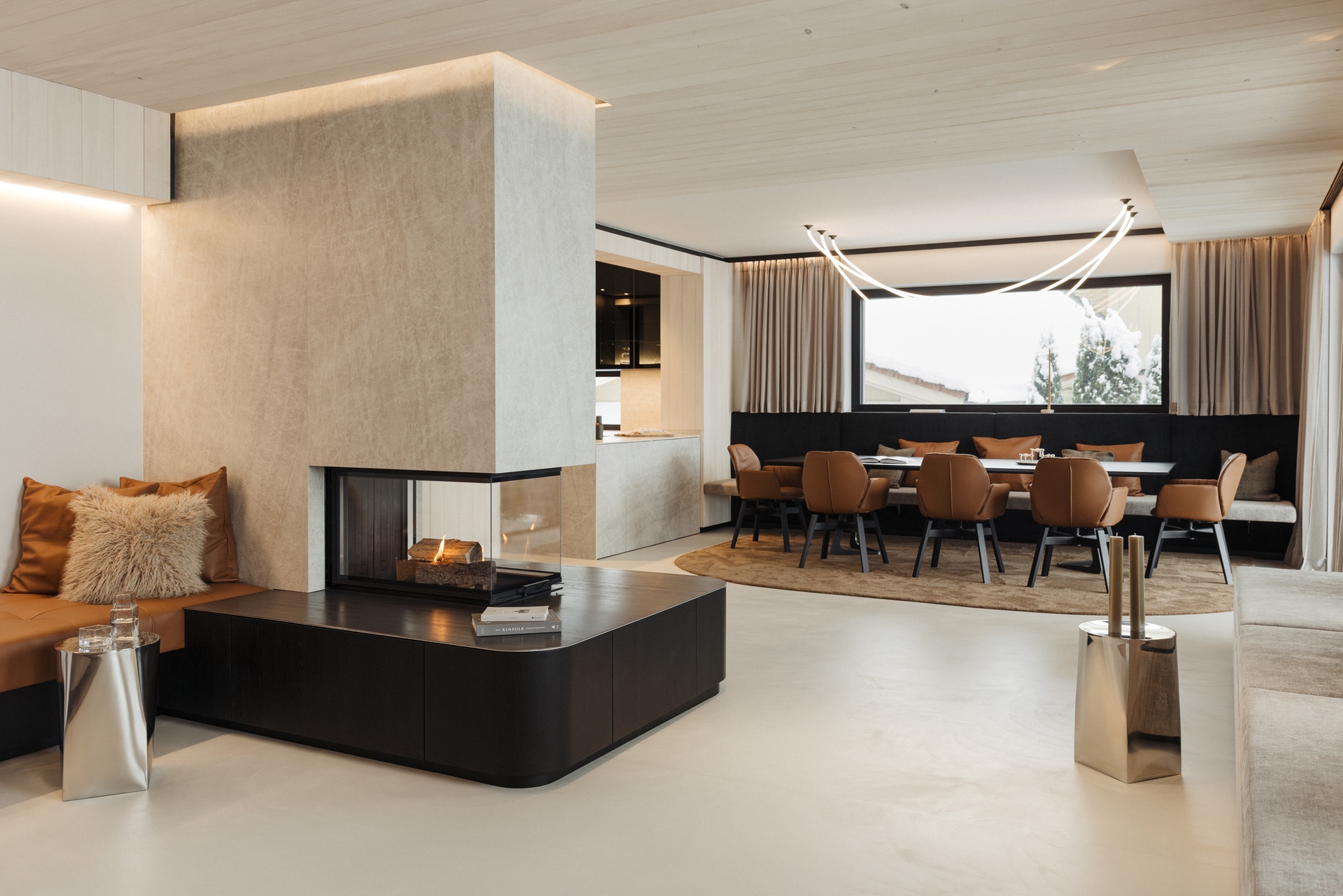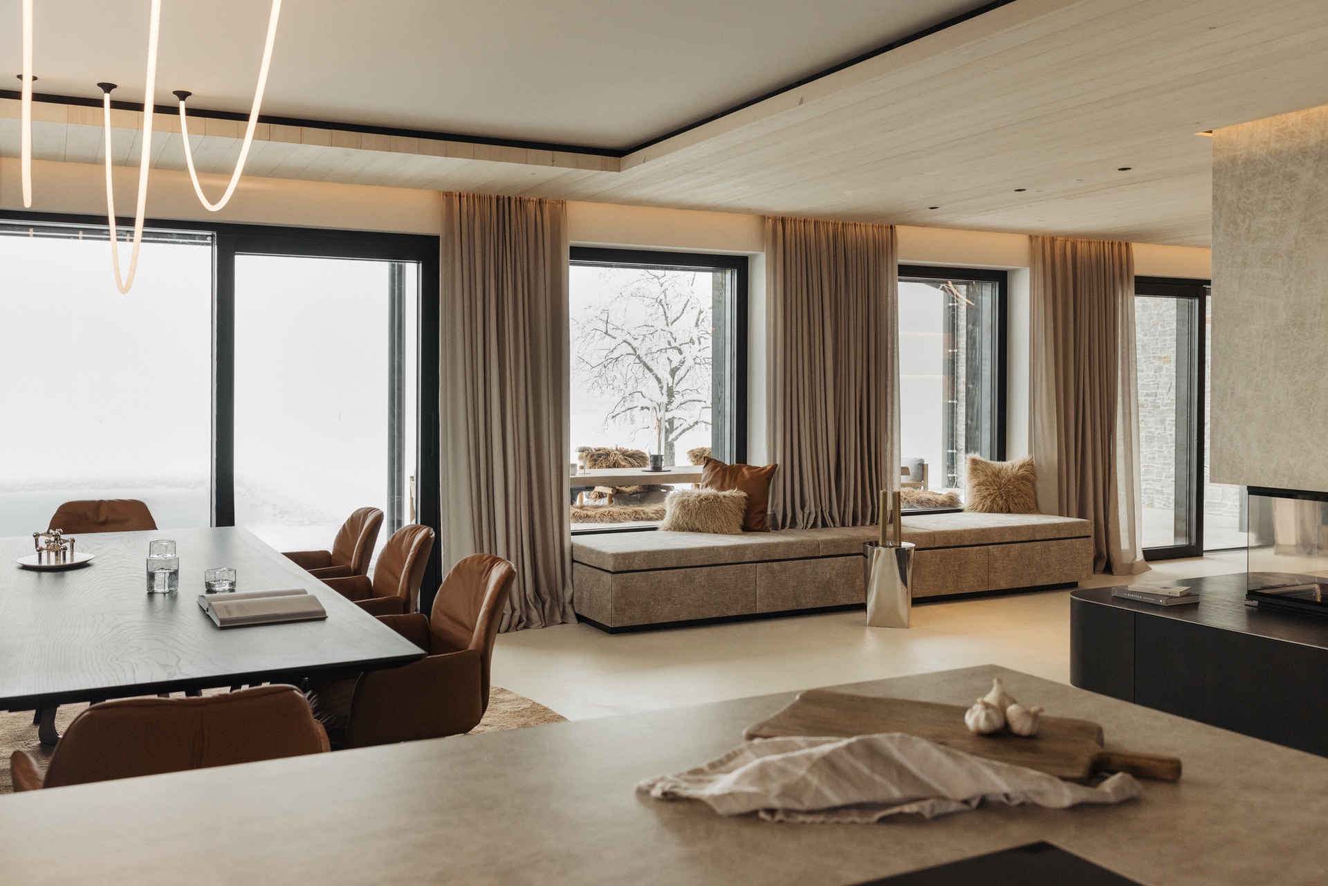 Eingebettet in die alpine Landschaft verbindet dieses Einfamilienhaus traditionelle Materialien mit zeitloser Architektur. Das von uns umgesetzte Innen- und Außendesign wird durch eine gehackte schwarze Holzfassade und eine handgemauerte Steinfassade mit organischer Fügung geprägt. Auch die komplette Innenarchitektur stammt von Stilhauer-Design und zeichnet sich durch weiß lasierte Weißtanne, Taj-Mahal-Stein in Küche und Hochschränken sowie durchgängige Bodenflächen in natürlicher Zementspachtelung aus. Warme Konjak-Töne in Leder- und handgewebten Stoffen schaffen eine behagliche, elegante Atmosphäre. Sämtliche Materialien und Oberflächen wurden in enger Abstimmung mit der Bauherrschaft sorgfältig bemustert und ausgewählt.