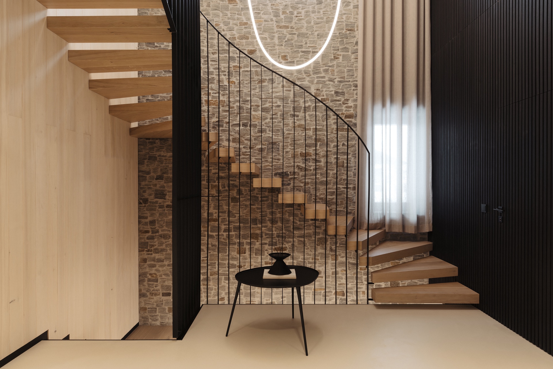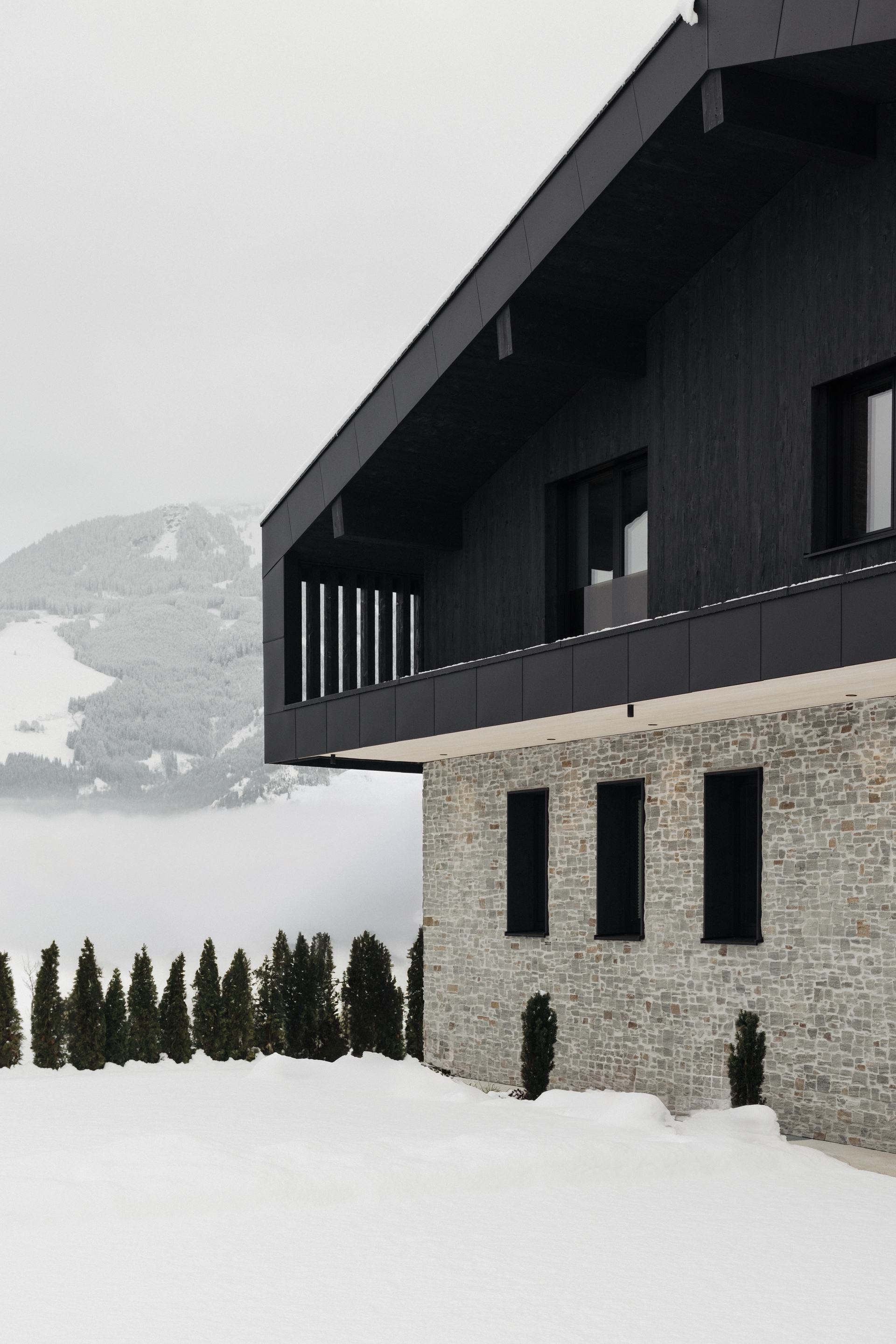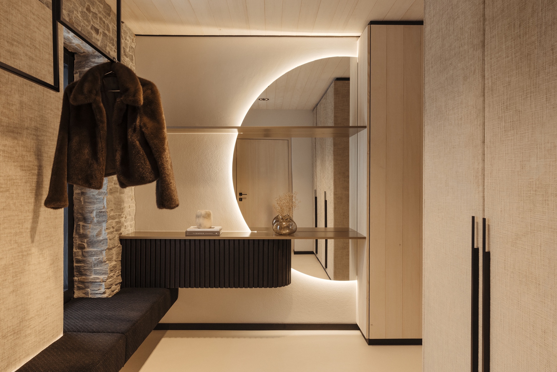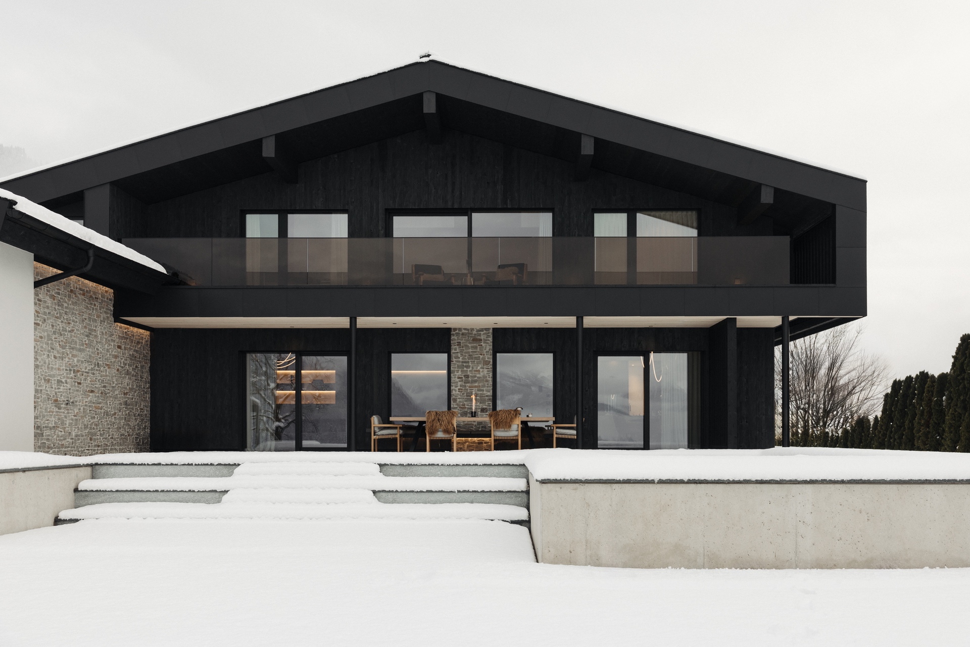 Eingebettet in die alpine Landschaft verbindet dieses Einfamilienhaus traditionelle Materialien mit zeitloser Architektur. Das von uns umgesetzte Innen- und Außendesign wird durch eine gehackte schwarze Holzfassade und eine handgemauerte Steinfassade mit organischer Fügung geprägt. Auch die komplette Innenarchitektur stammt von Stilhauer-Design und zeichnet sich durch weiß lasierte Weißtanne, Taj-Mahal-Stein in Küche und Hochschränken sowie durchgängige Bodenflächen in natürlicher Zementspachtelung aus. Warme Konjak-Töne in Leder- und handgewebten Stoffen schaffen eine behagliche, elegante Atmosphäre. Sämtliche Materialien und Oberflächen wurden in enger Abstimmung mit der Bauherrschaft sorgfältig bemustert und ausgewählt.