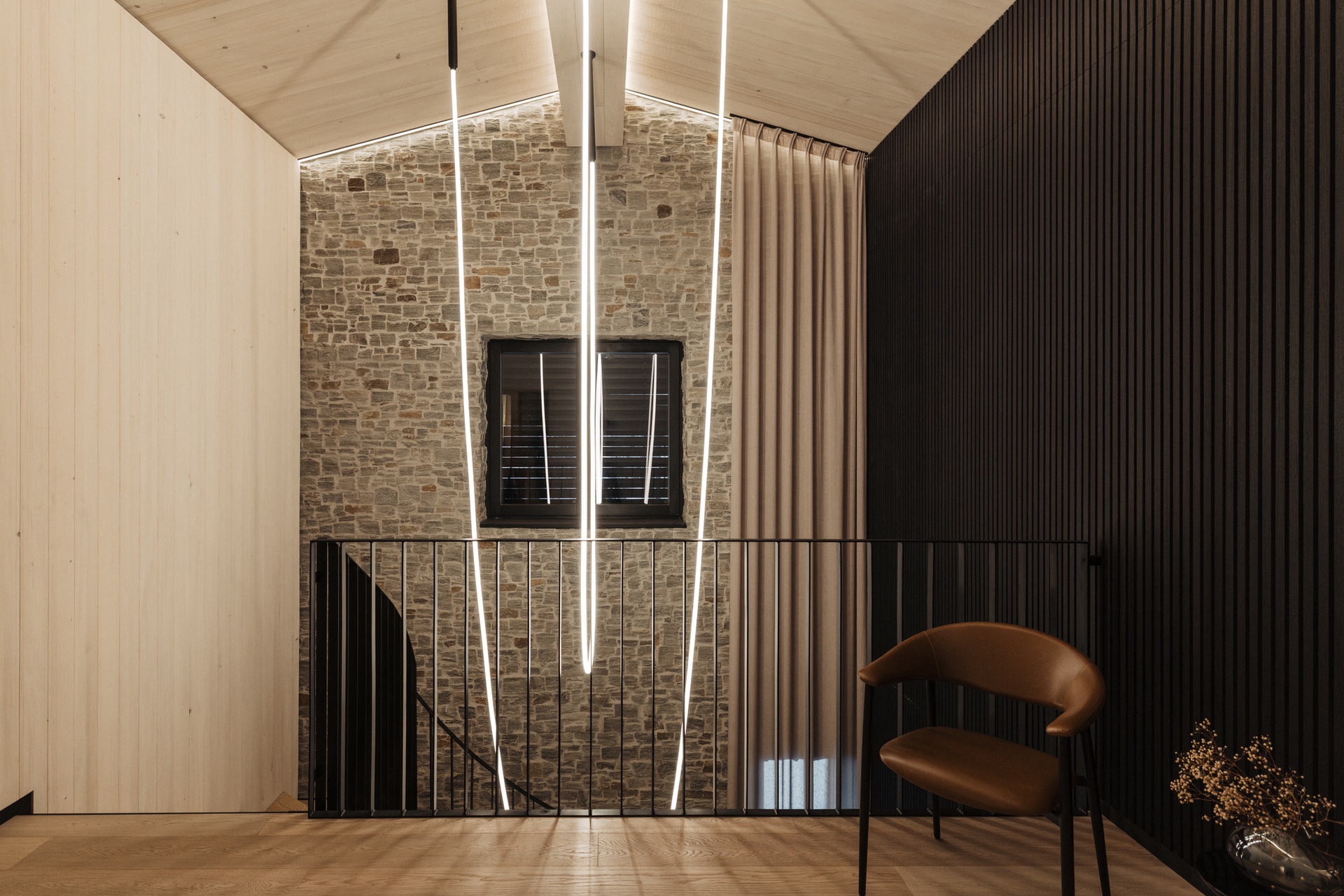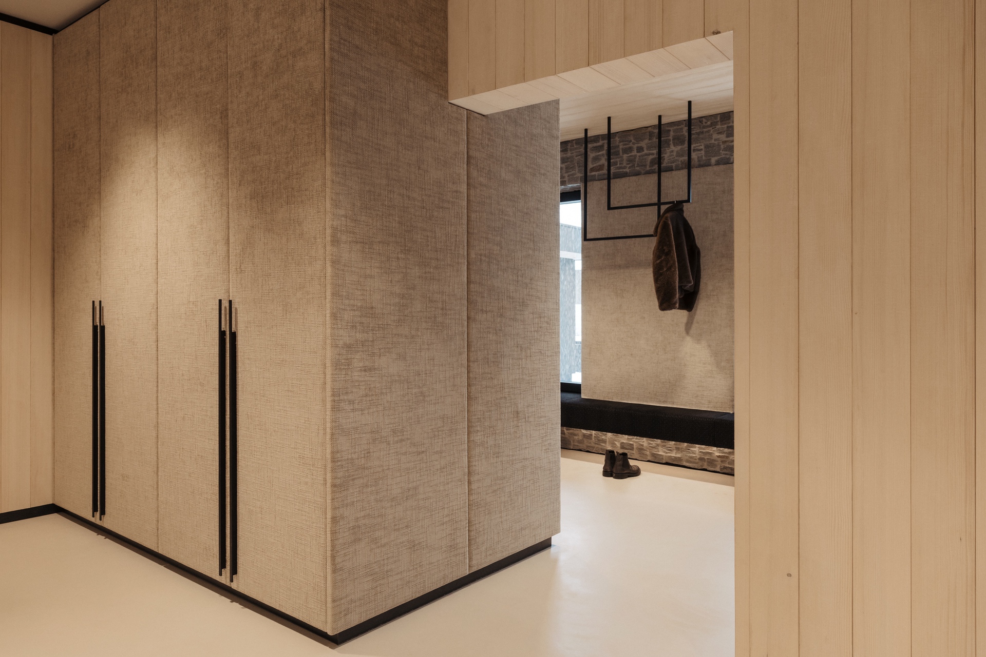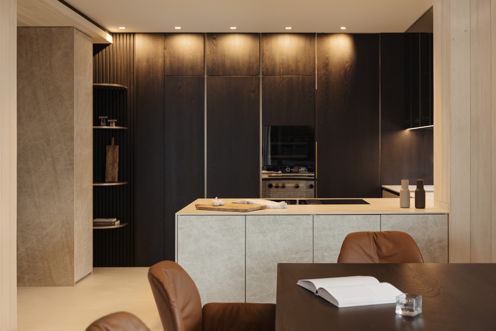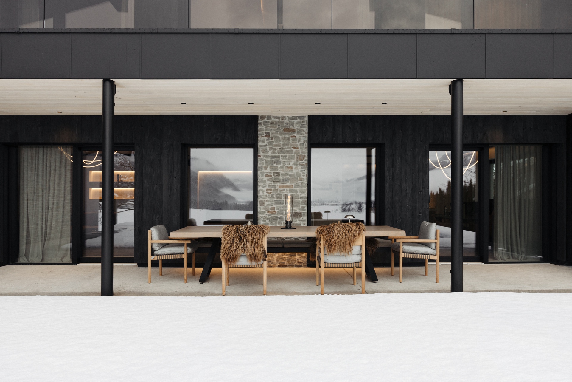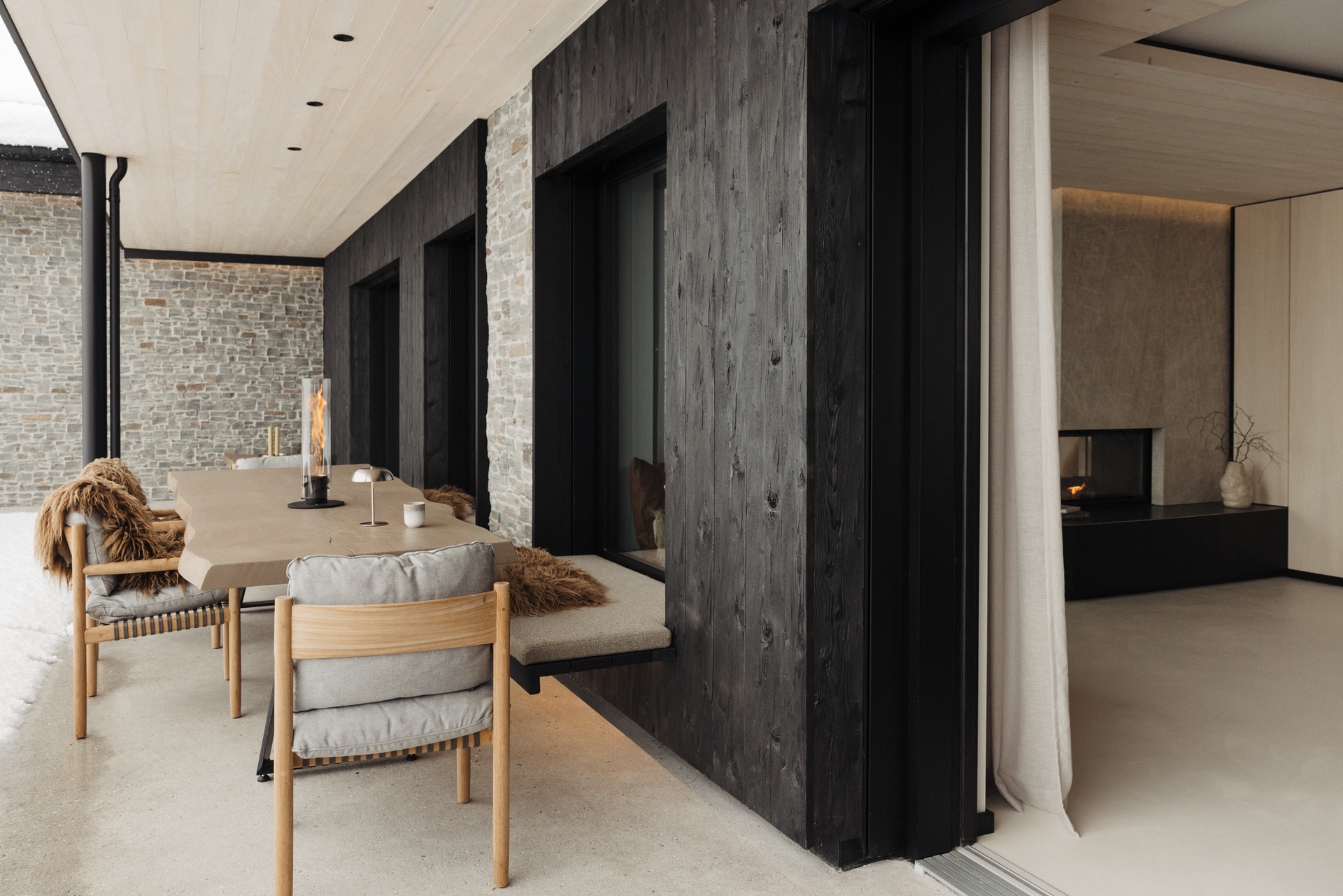 Eingebettet in die alpine Landschaft verbindet dieses Einfamilienhaus traditionelle Materialien mit zeitloser Architektur. Das von uns umgesetzte Innen- und Außendesign wird durch eine gehackte schwarze Holzfassade und eine handgemauerte Steinfassade mit organischer Fügung geprägt. Auch die komplette Innenarchitektur stammt von Stilhauer-Design und zeichnet sich durch weiß lasierte Weißtanne, Taj-Mahal-Stein in Küche und Hochschränken sowie durchgängige Bodenflächen in natürlicher Zementspachtelung aus. Warme Konjak-Töne in Leder- und handgewebten Stoffen schaffen eine behagliche, elegante Atmosphäre. Sämtliche Materialien und Oberflächen wurden in enger Abstimmung mit der Bauherrschaft sorgfältig bemustert und ausgewählt.