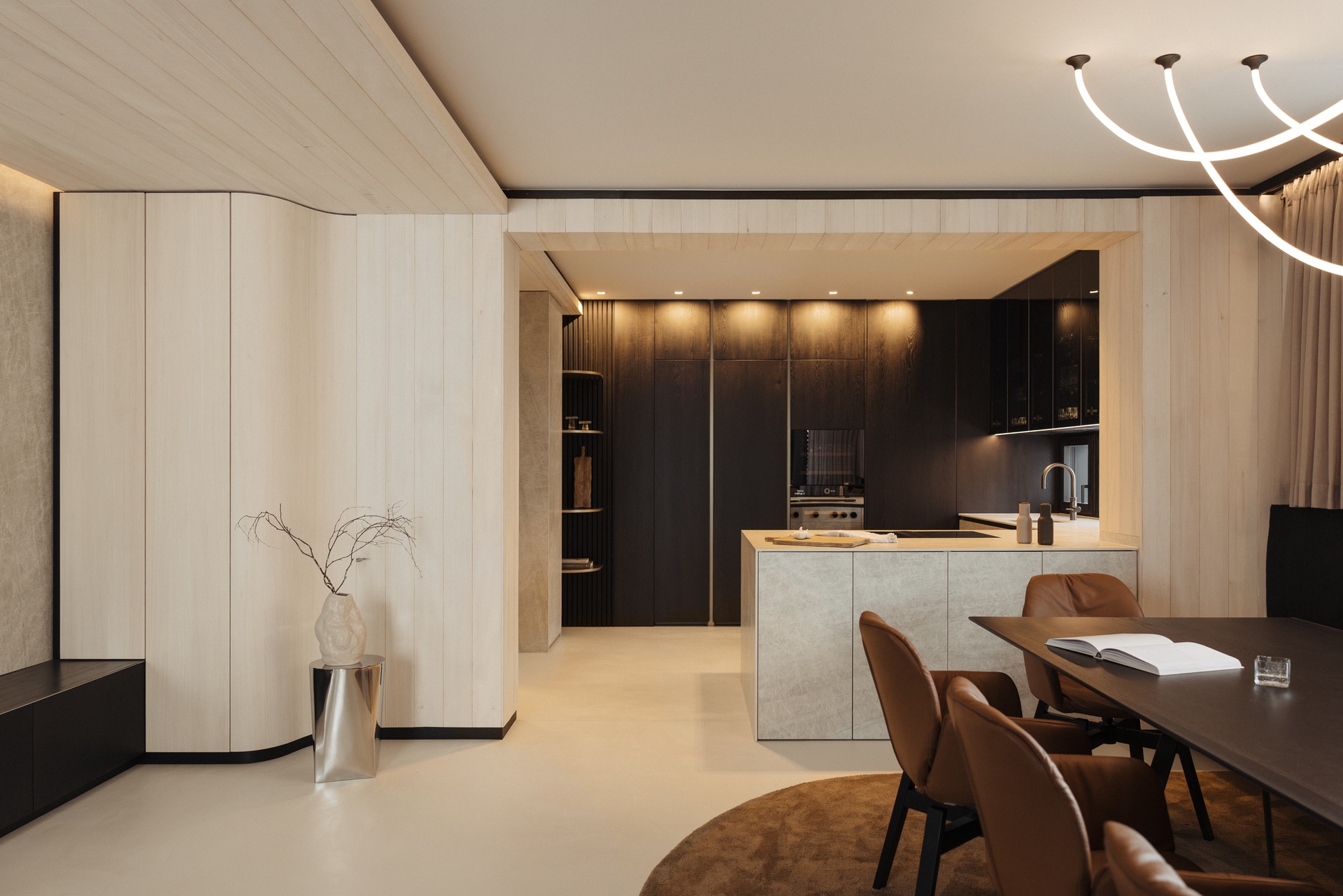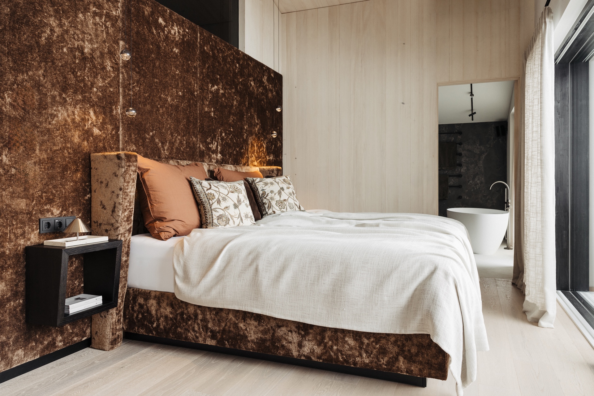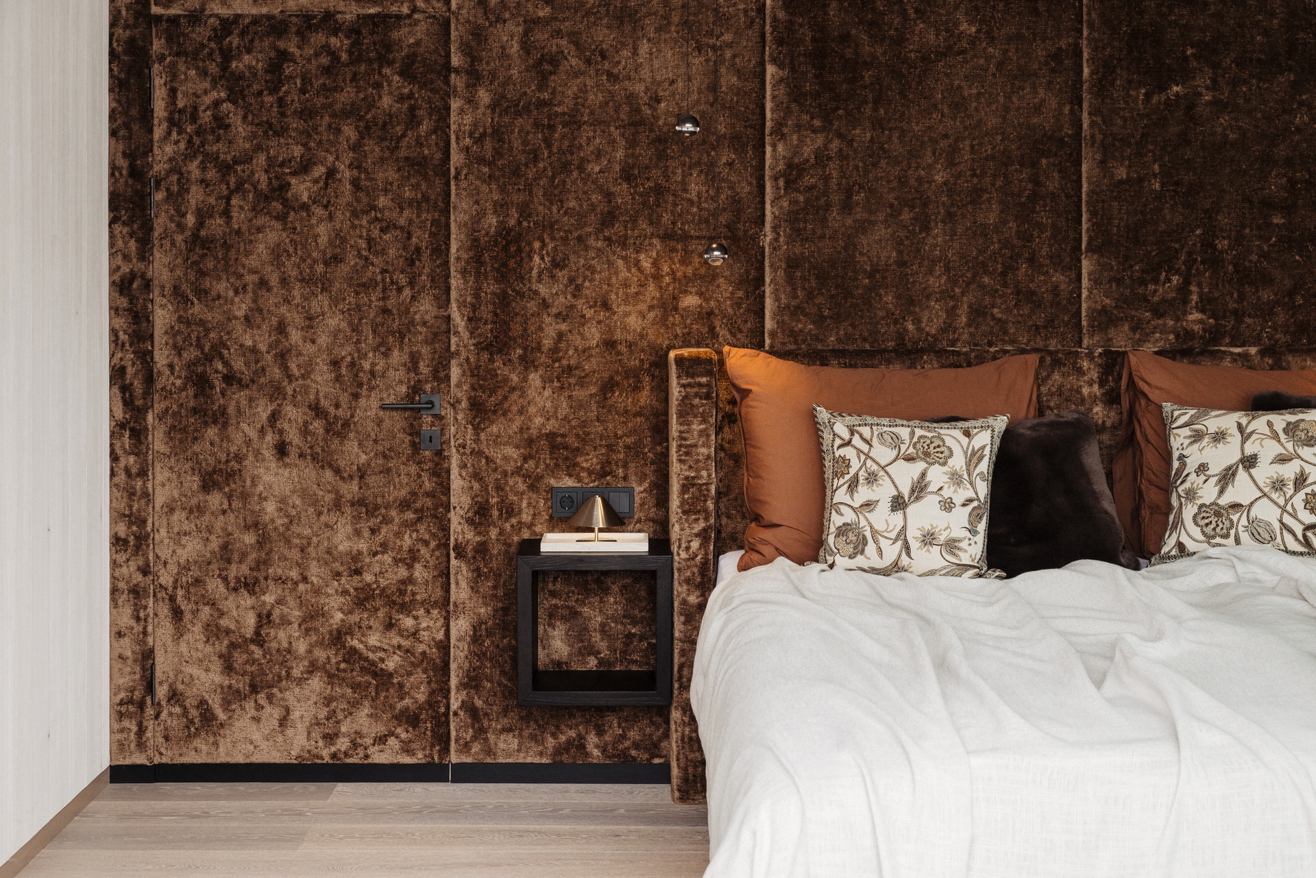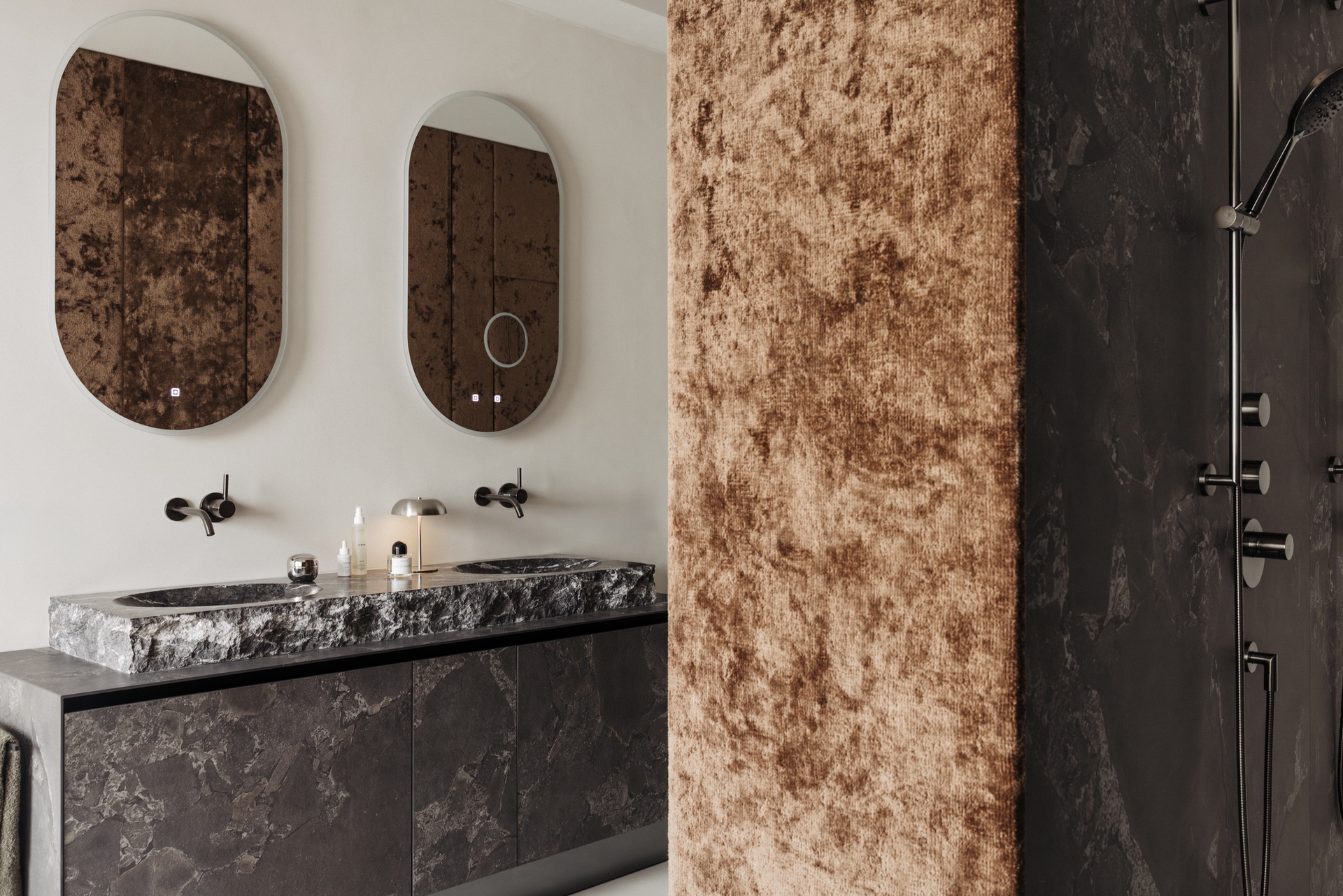 Eingebettet in die alpine Landschaft verbindet dieses Einfamilienhaus traditionelle Materialien mit zeitloser Architektur. Das von uns umgesetzte Innen- und Außendesign wird durch eine gehackte schwarze Holzfassade und eine handgemauerte Steinfassade mit organischer Fügung geprägt. Auch die komplette Innenarchitektur stammt von Stilhauer-Design und zeichnet sich durch weiß lasierte Weißtanne, Taj-Mahal-Stein in Küche und Hochschränken sowie durchgängige Bodenflächen in natürlicher Zementspachtelung aus. Warme Konjak-Töne in Leder- und handgewebten Stoffen schaffen eine behagliche, elegante Atmosphäre. Sämtliche Materialien und Oberflächen wurden in enger Abstimmung mit der Bauherrschaft sorgfältig bemustert und ausgewählt.