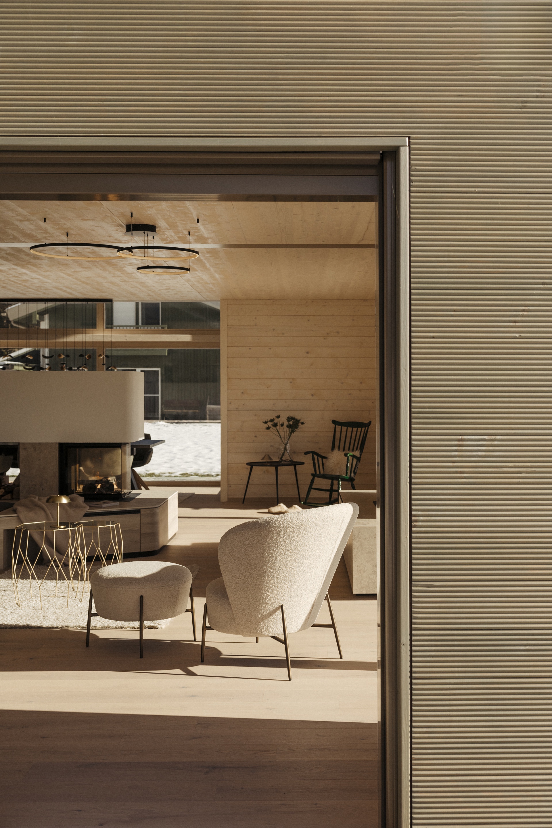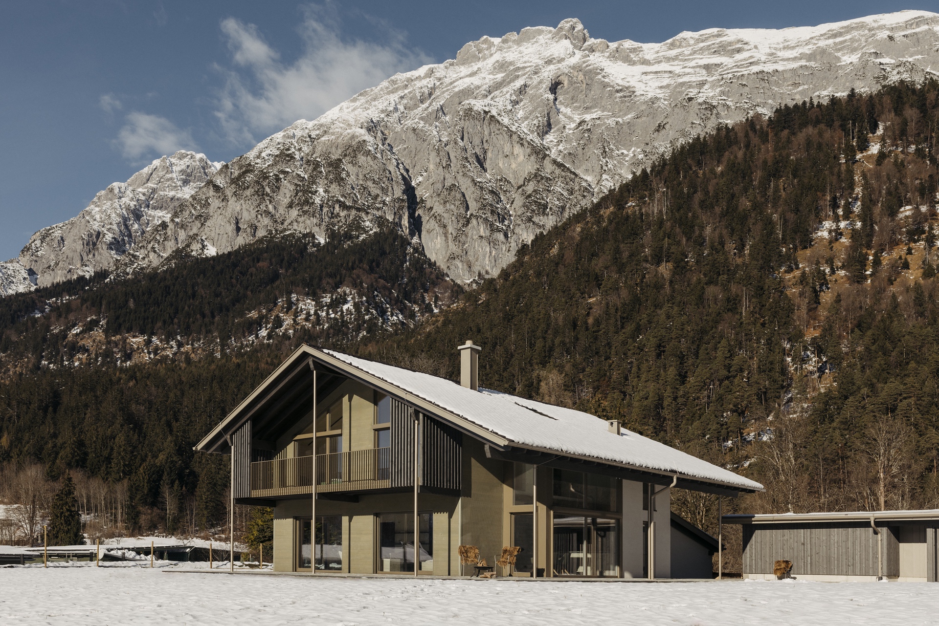 Das neue Landhaus fügt sich harmonisch zwischen dem bestehenden Elternhaus und dem Reitgestüt in die Tiroler Landschaft ein. Die traditionelle Grüntonpalette wurde mit modernen Metallikakzenten in Grün, Bronze und Titan neu interpretiert.