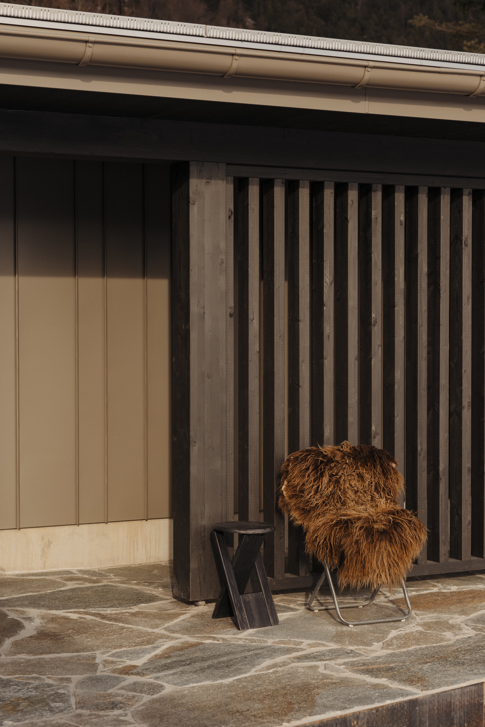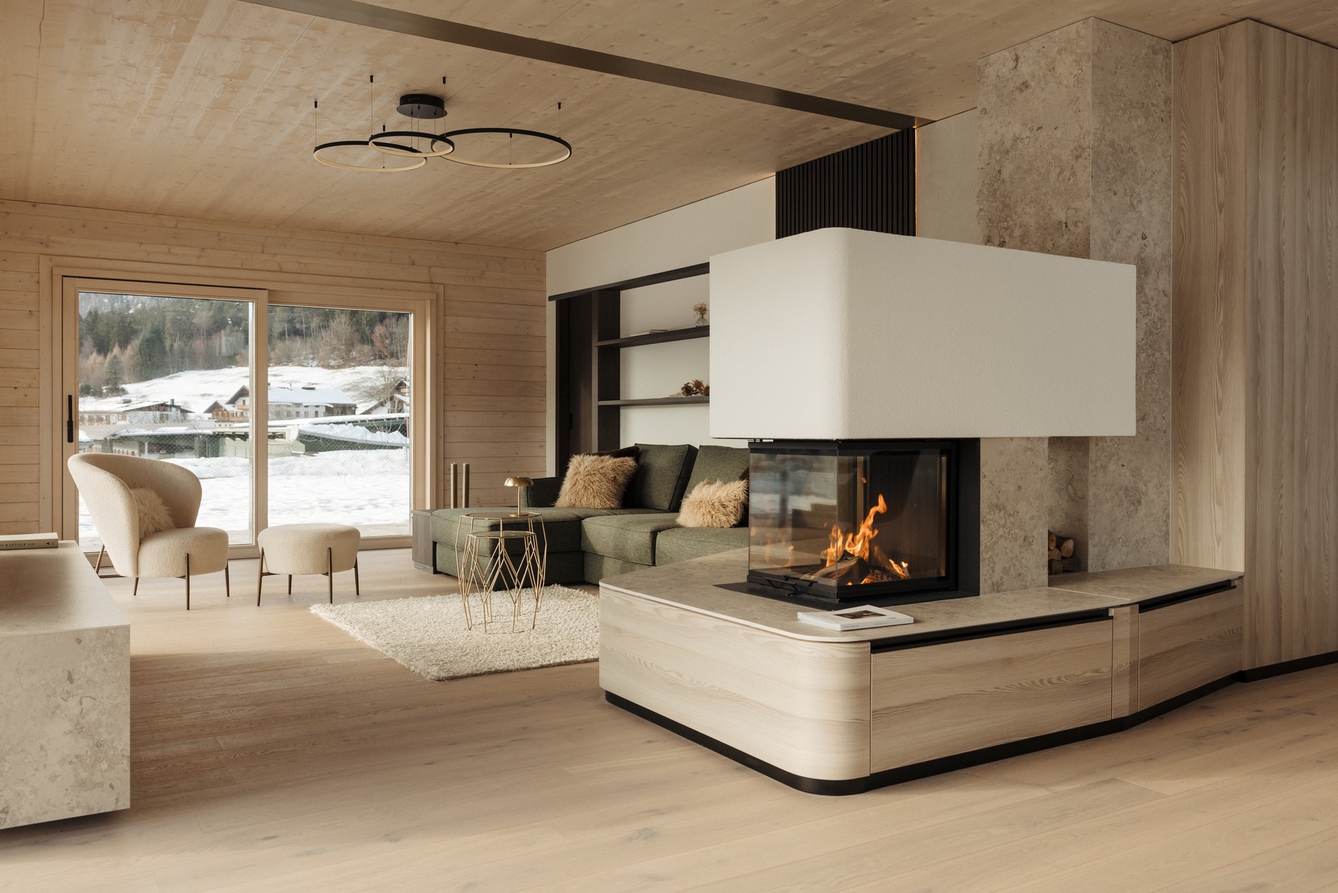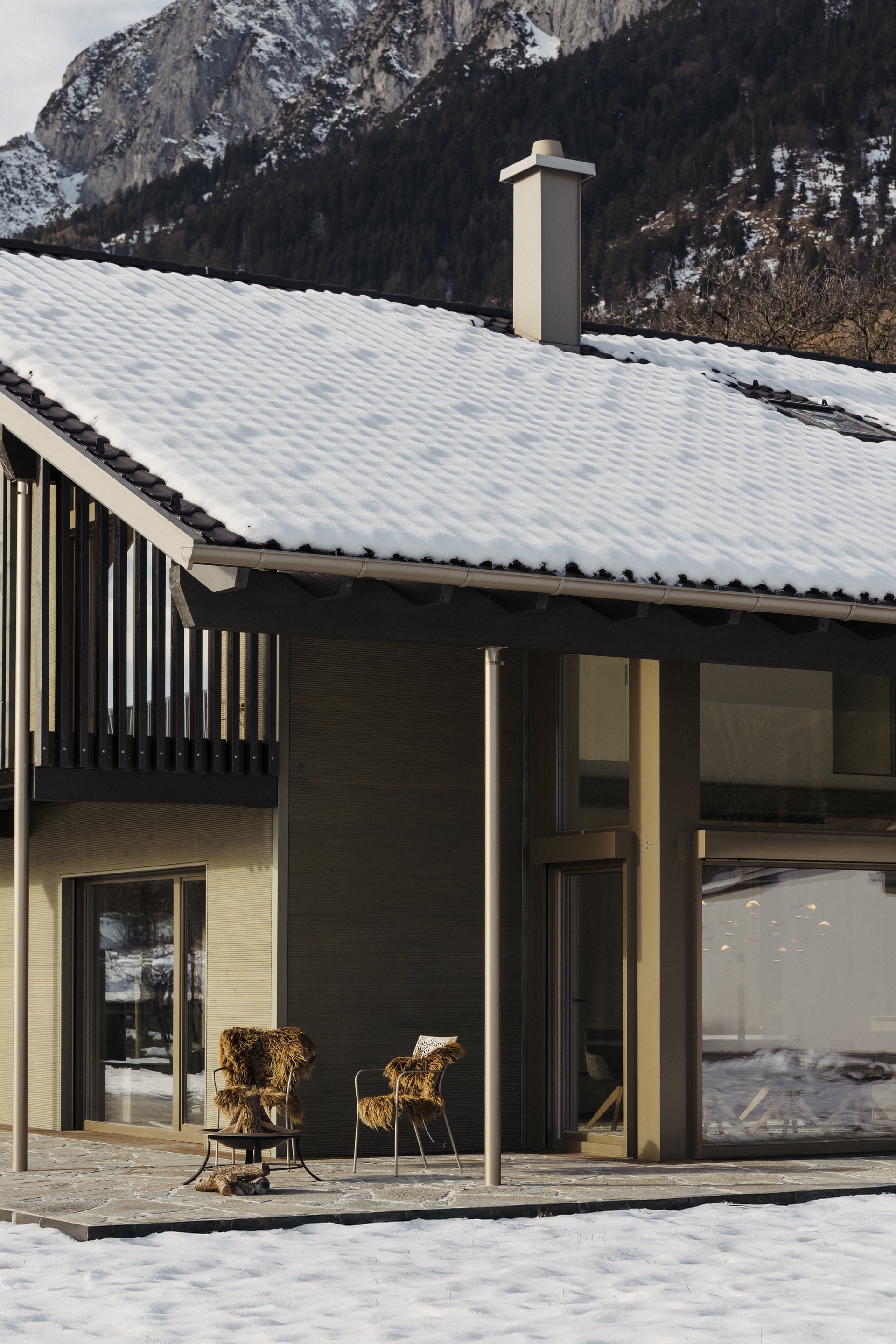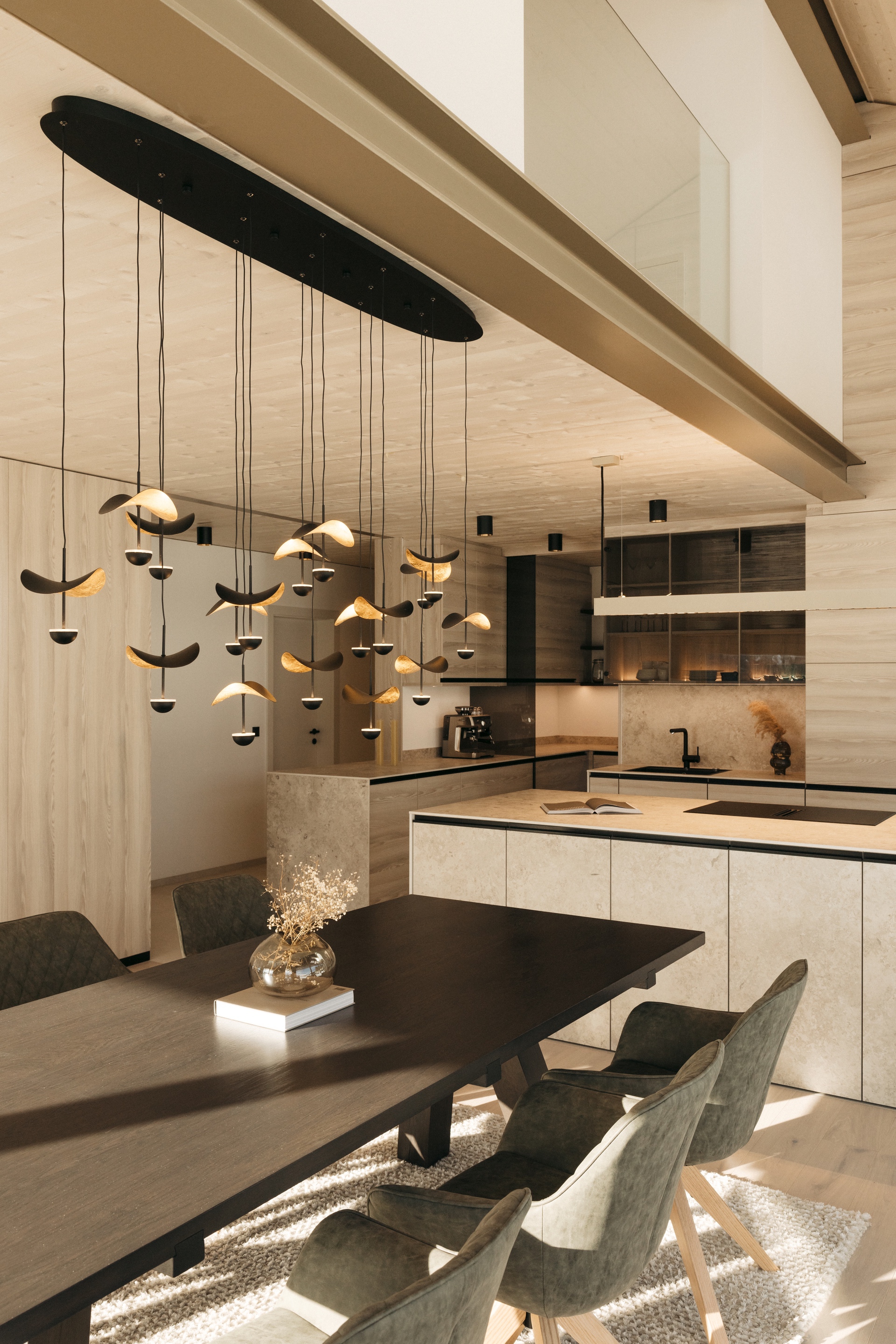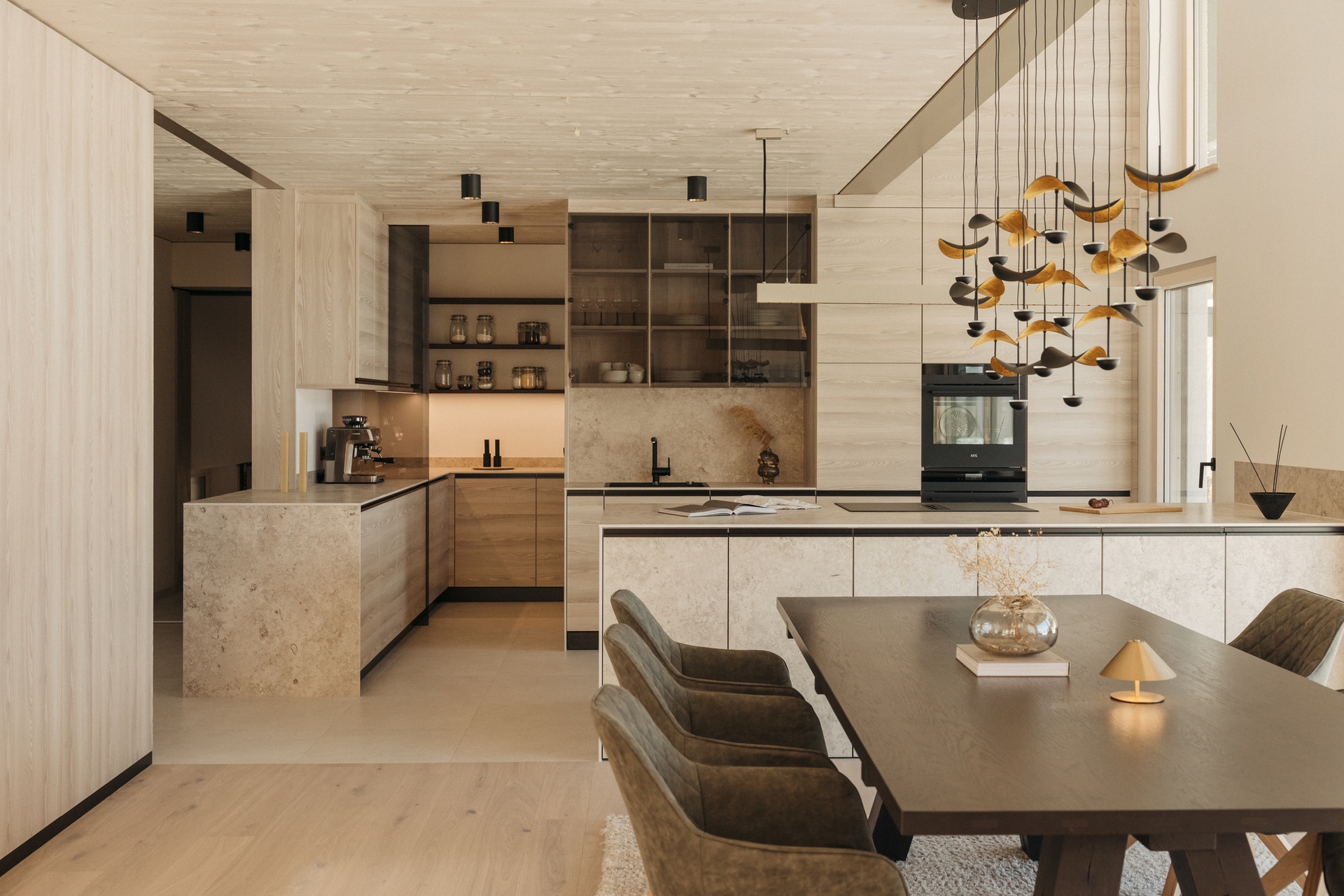 Bronzefarbene Stahl- und Fensterelemente verbinden Außen- und Innenbereich und mildern die Kontraste von Grün und Schwarz. Warme Esche-Holzoberflächen und edle Steinflächen in Küche und Bad schaffen ein stimmiges, durchgängiges Materialkonzept. Der polygonal verlegte Lusernagnes-Boden mit braun-grünen Einschlüssen unterstreicht die natürliche Wertigkeit des Hauses.