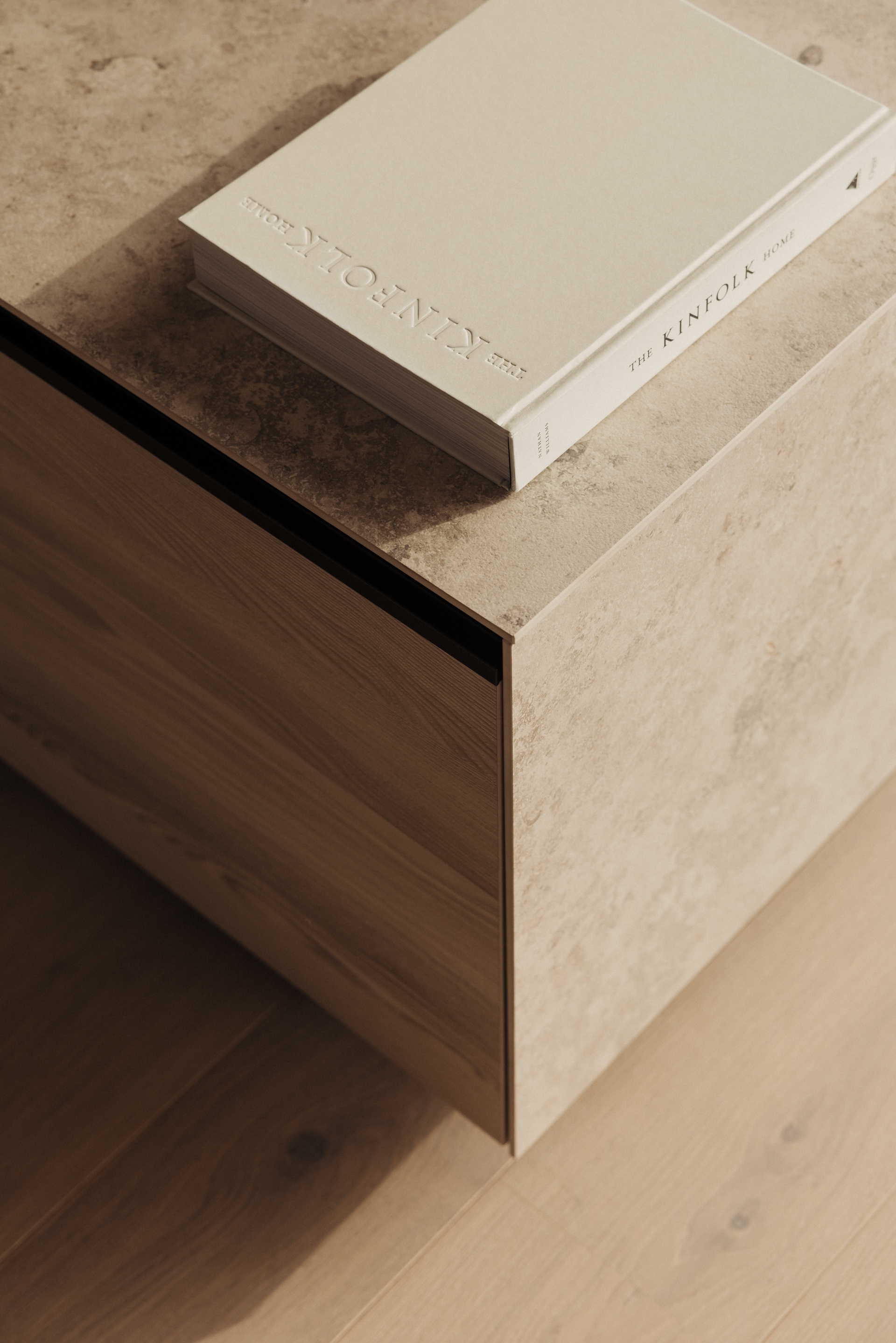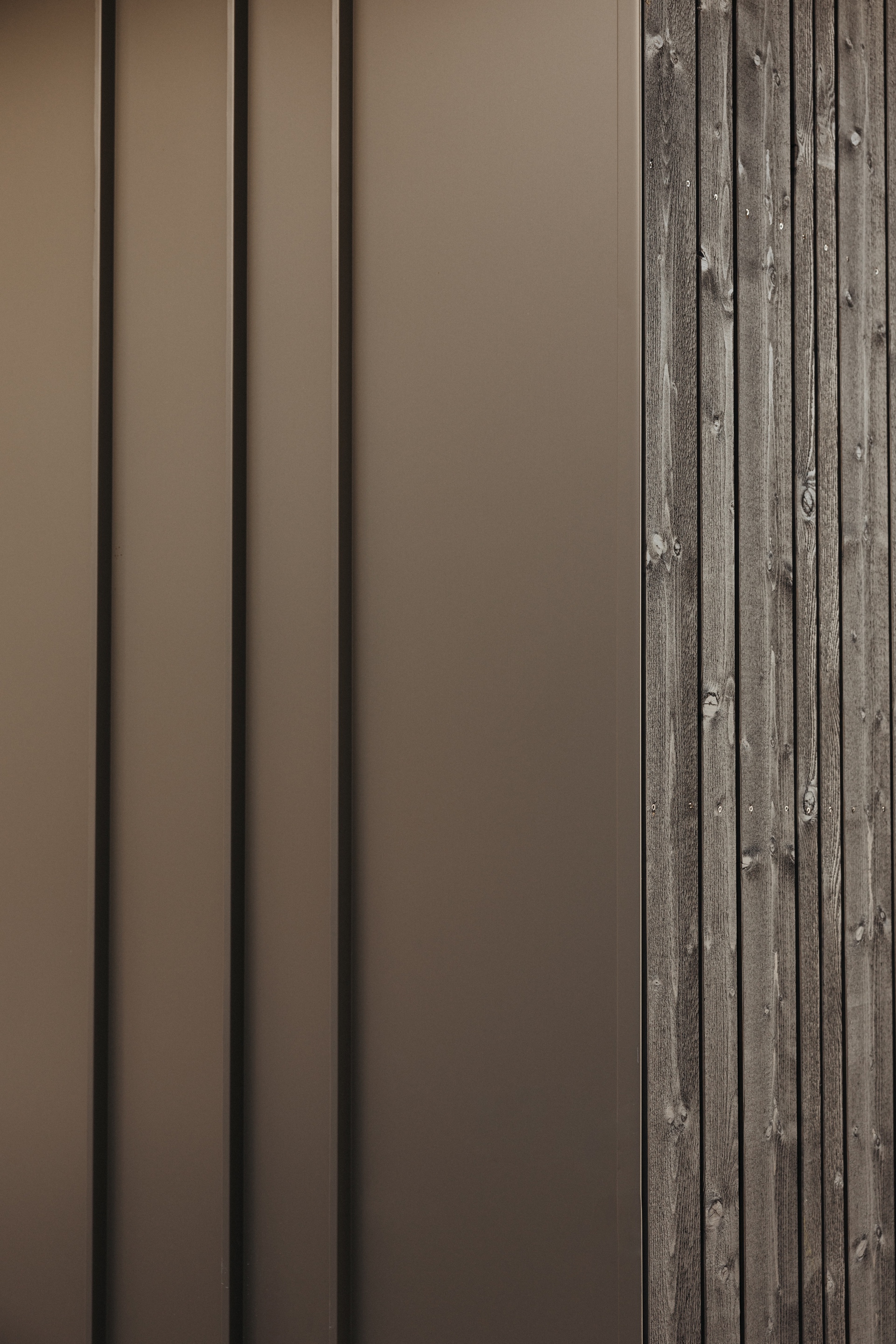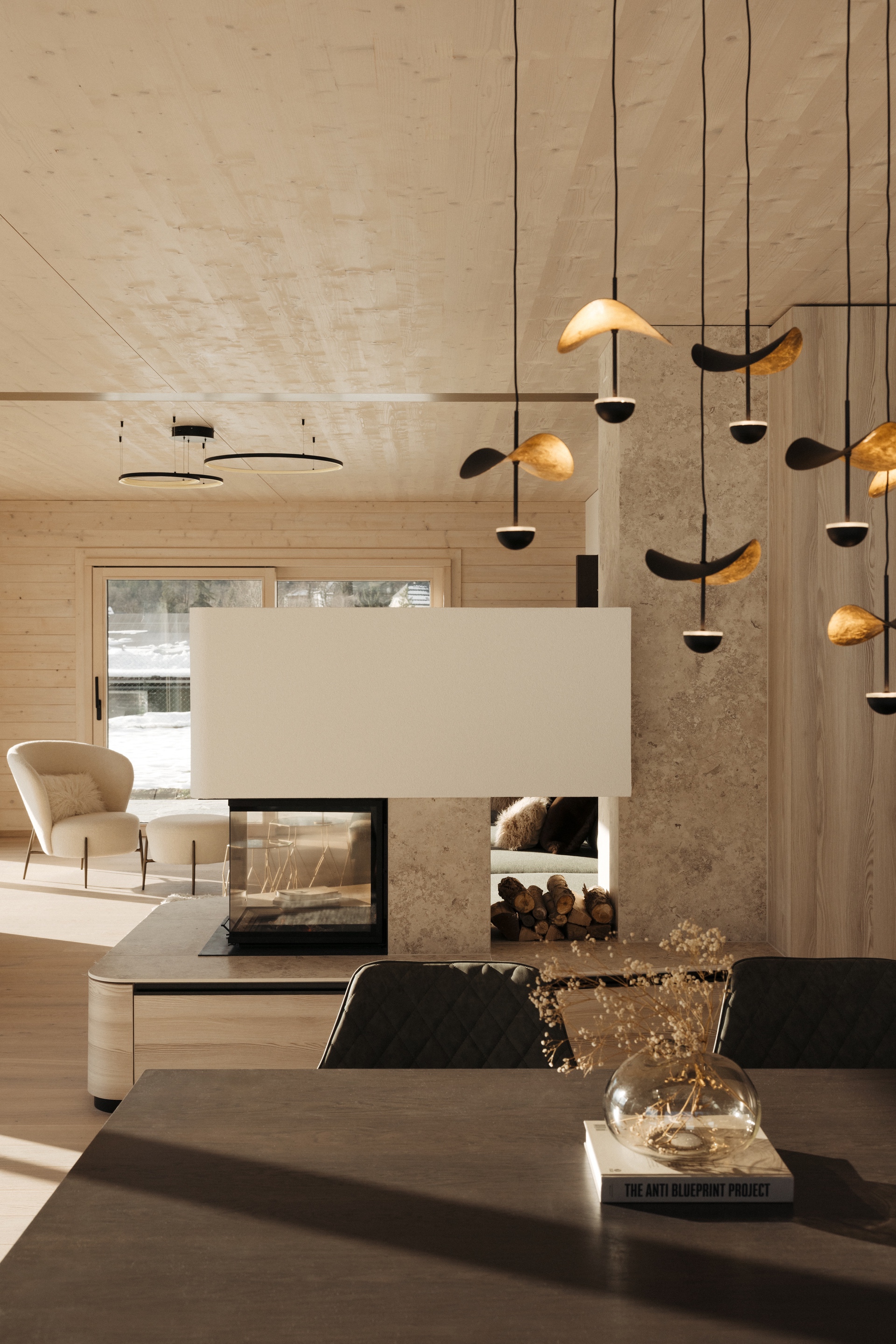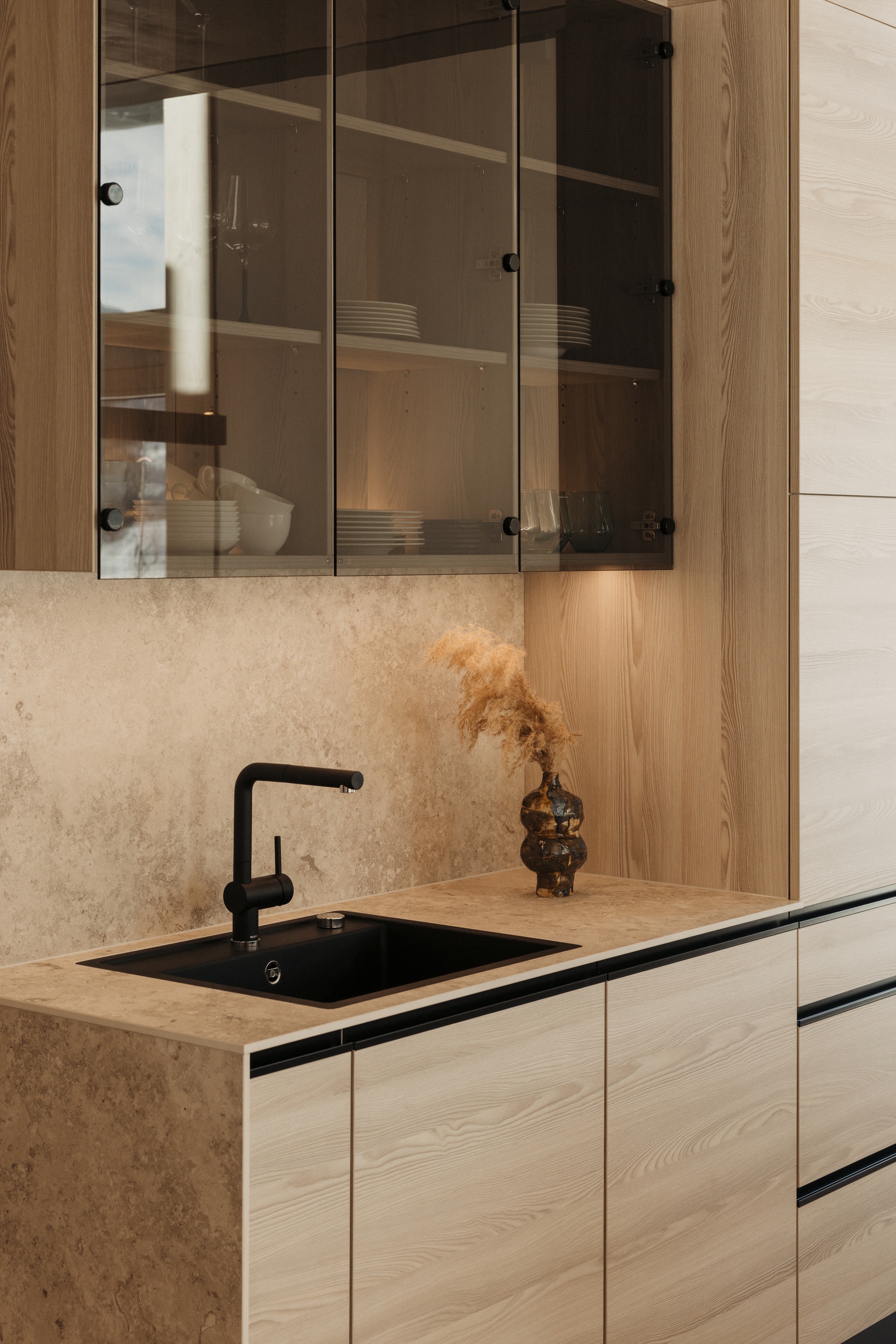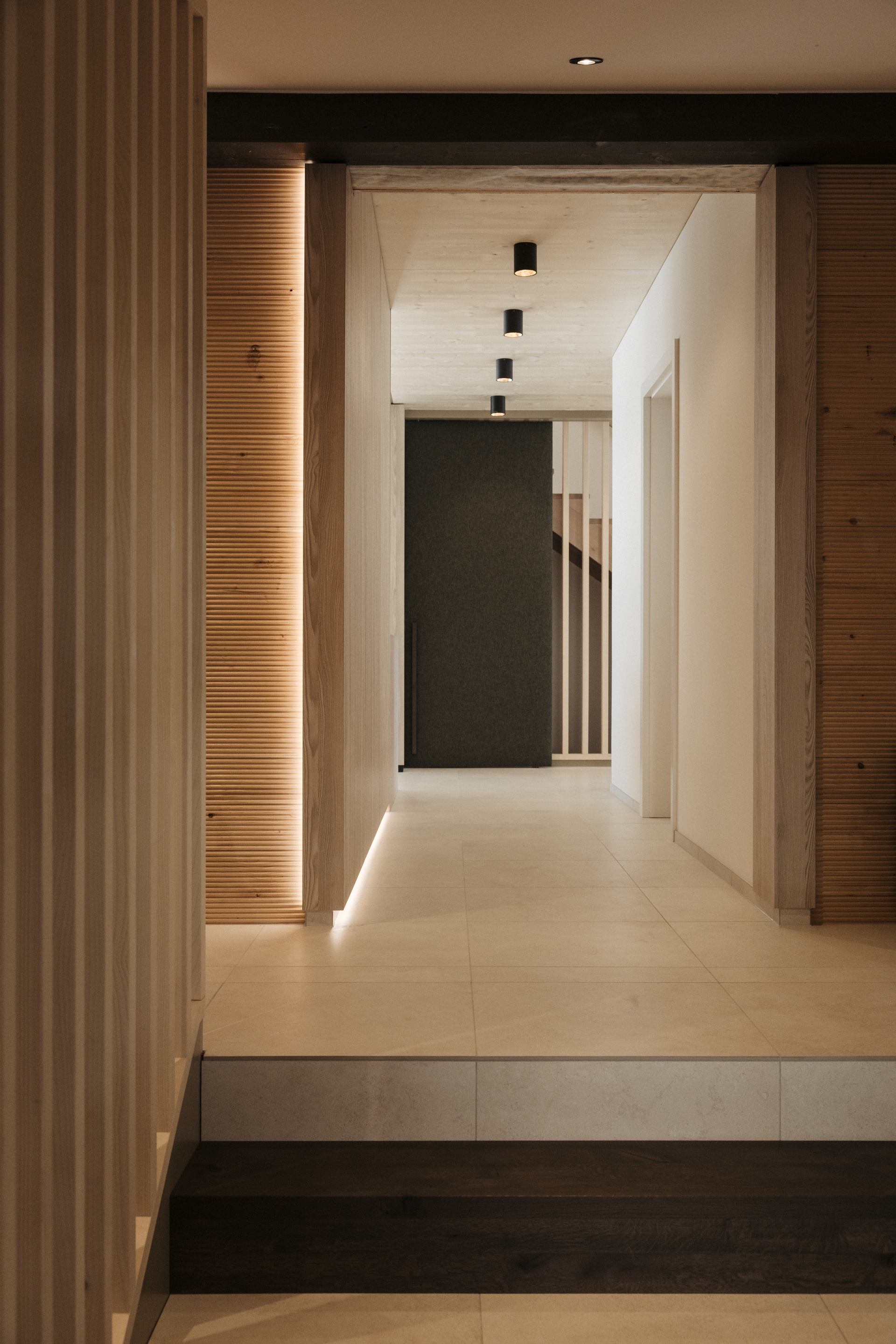 Bronzefarbene Stahl- und Fensterelemente verbinden Außen- und Innenbereich und mildern die Kontraste von Grün und Schwarz. Warme Esche-Holzoberflächen und edle Steinflächen in Küche und Bad schaffen ein stimmiges, durchgängiges Materialkonzept. Der polygonal verlegte Lusernagnes-Boden mit braun-grünen Einschlüssen unterstreicht die natürliche Wertigkeit des Hauses.